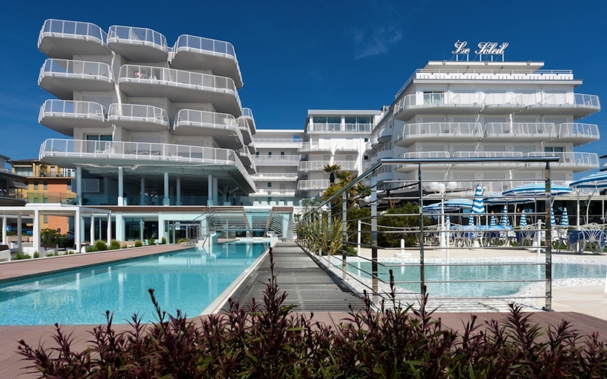 Das 4*Hotel Le Soleil erwartet Sie in erstklassiger Lage direkt am Meer und nur wenige Schritte von der belebten Fußgängerzone von Lido di Jesolo entfernt. Zahlreiche Geschäfte, Restaurants und Cafés befinden sich in unmittelbarer Nähe. Zur Ausstattung des Hauses gehören ein Restaurant, eine Lounge-Bar sowie ein Aufzug. Zwei Swimmingpools mit Sonnenterrasse laden zum Entspannen ein. Eine Terrasse mit Meerblick bietet zusätzliche Rückzugsmöglichkeiten. Im Spa- und Wellnesscenter im obersten Stockwerk (gegen Aufpreis) finden Sie Sauna und einen Ruhebereich. Ein Fitnessraum rundet das Angebot ab. Die komfortablen Zimmer sind freundlich und modern eingerichtet und verfügen über Bad oder DU/WC, Klimaanlage/Heizung, TV, Telefon, Safe, Minibar, Fön sowie kostenfreies WLAN.